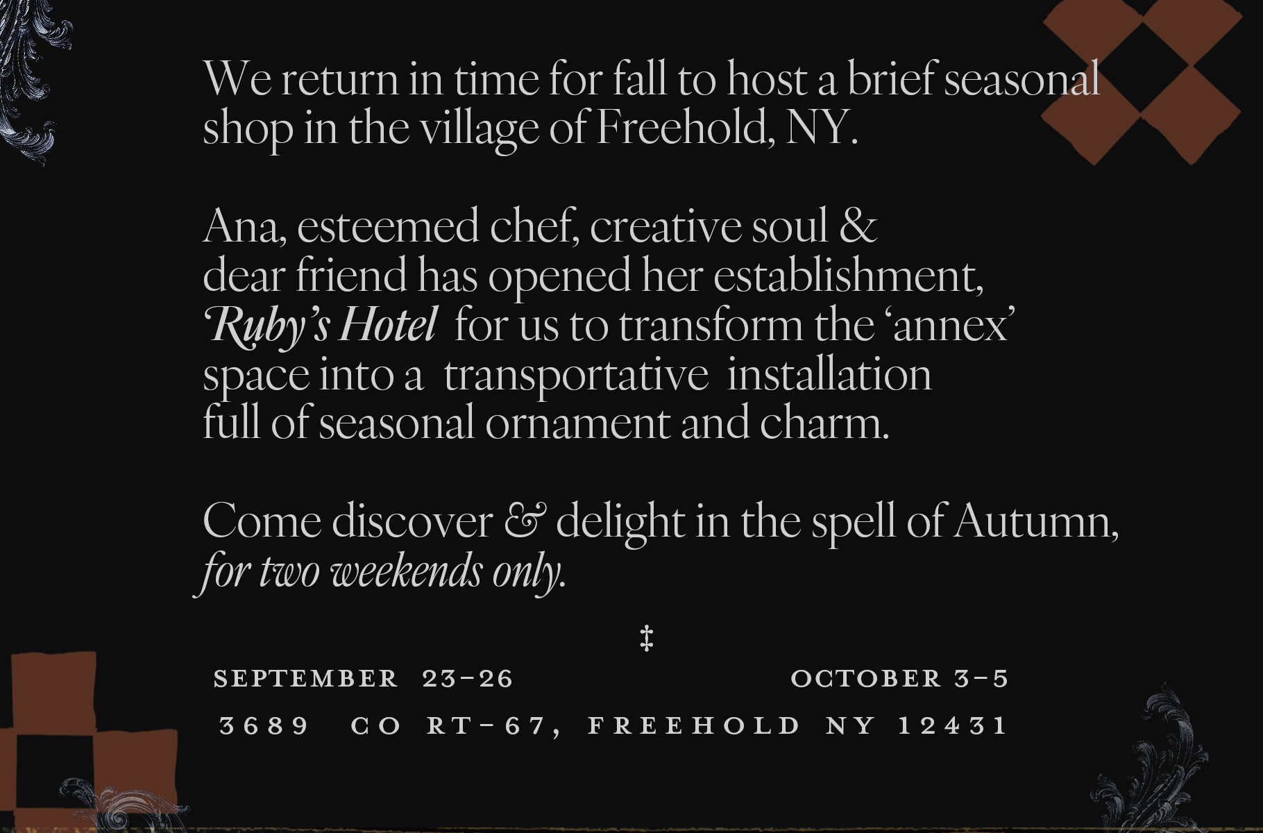 A gathering of the collected and the crafted, inspired by the tones and textures of fall. A season of brilliance, coziness, and transformation.